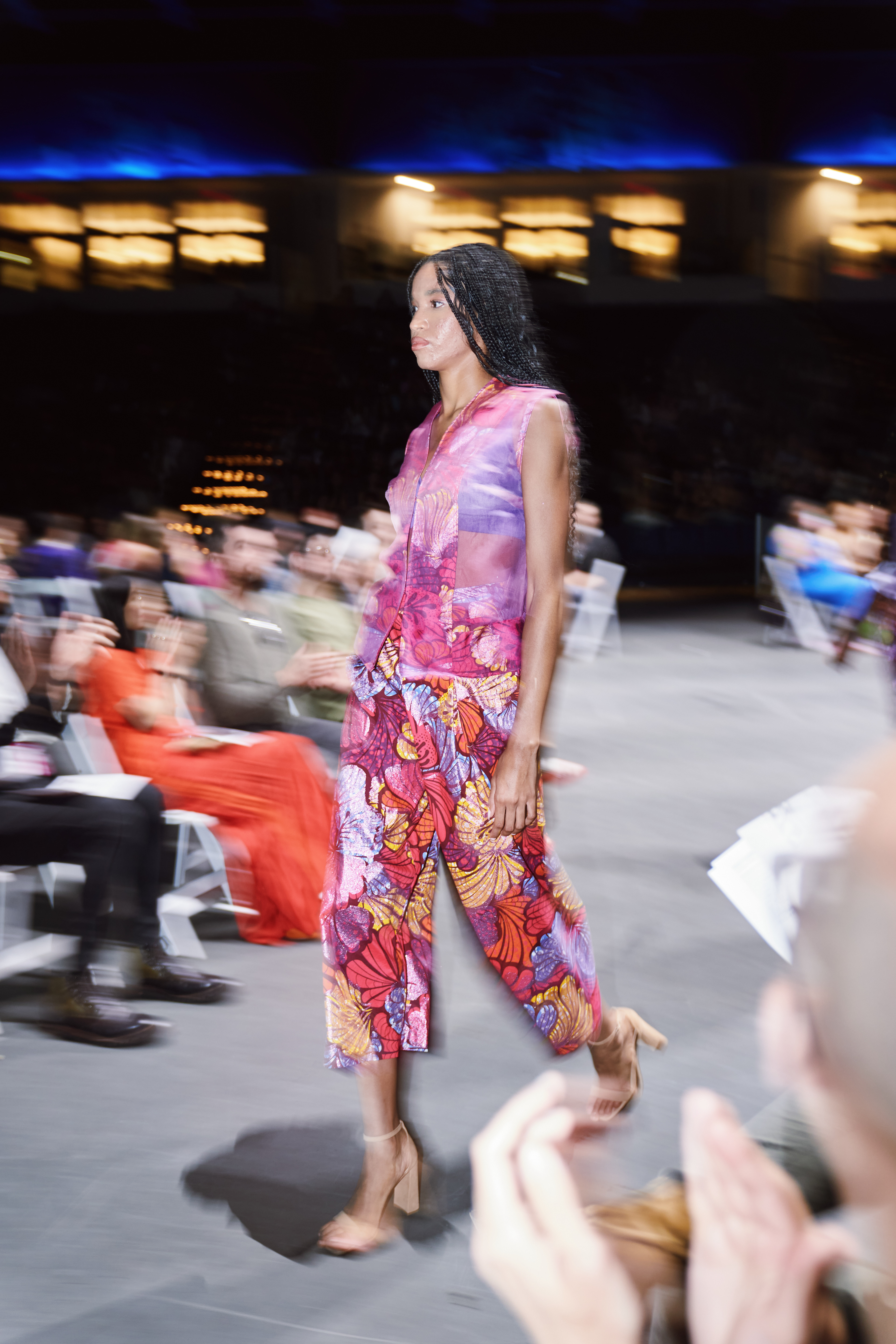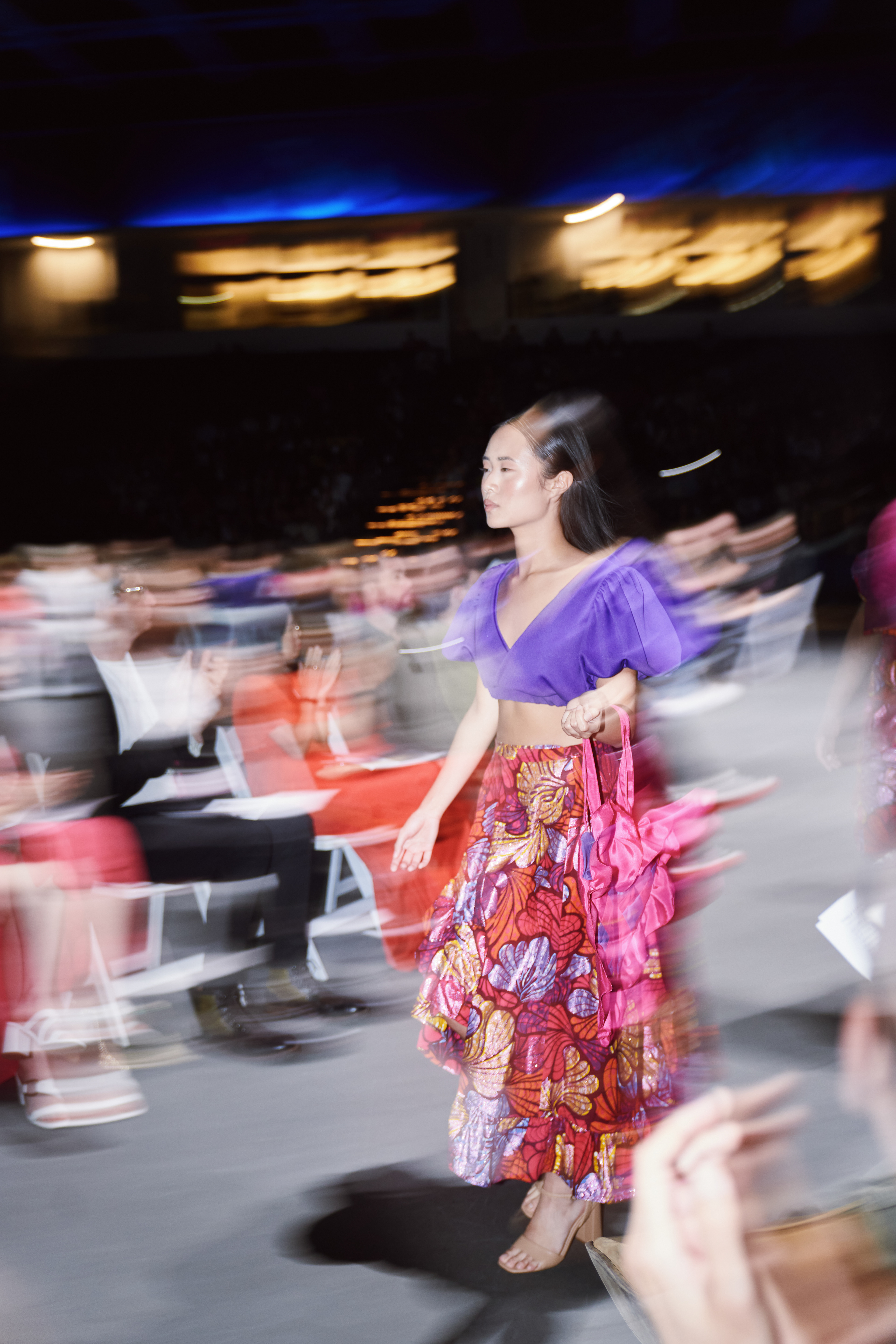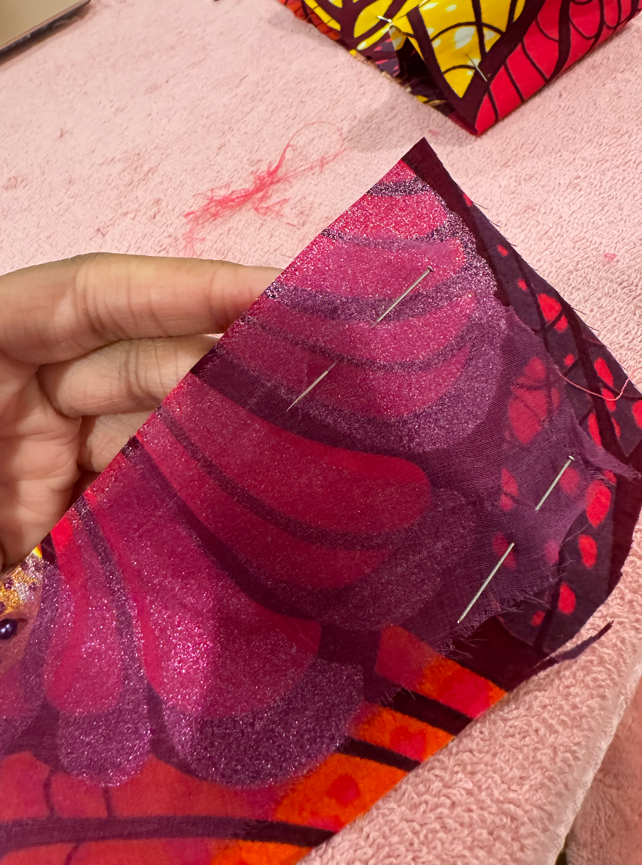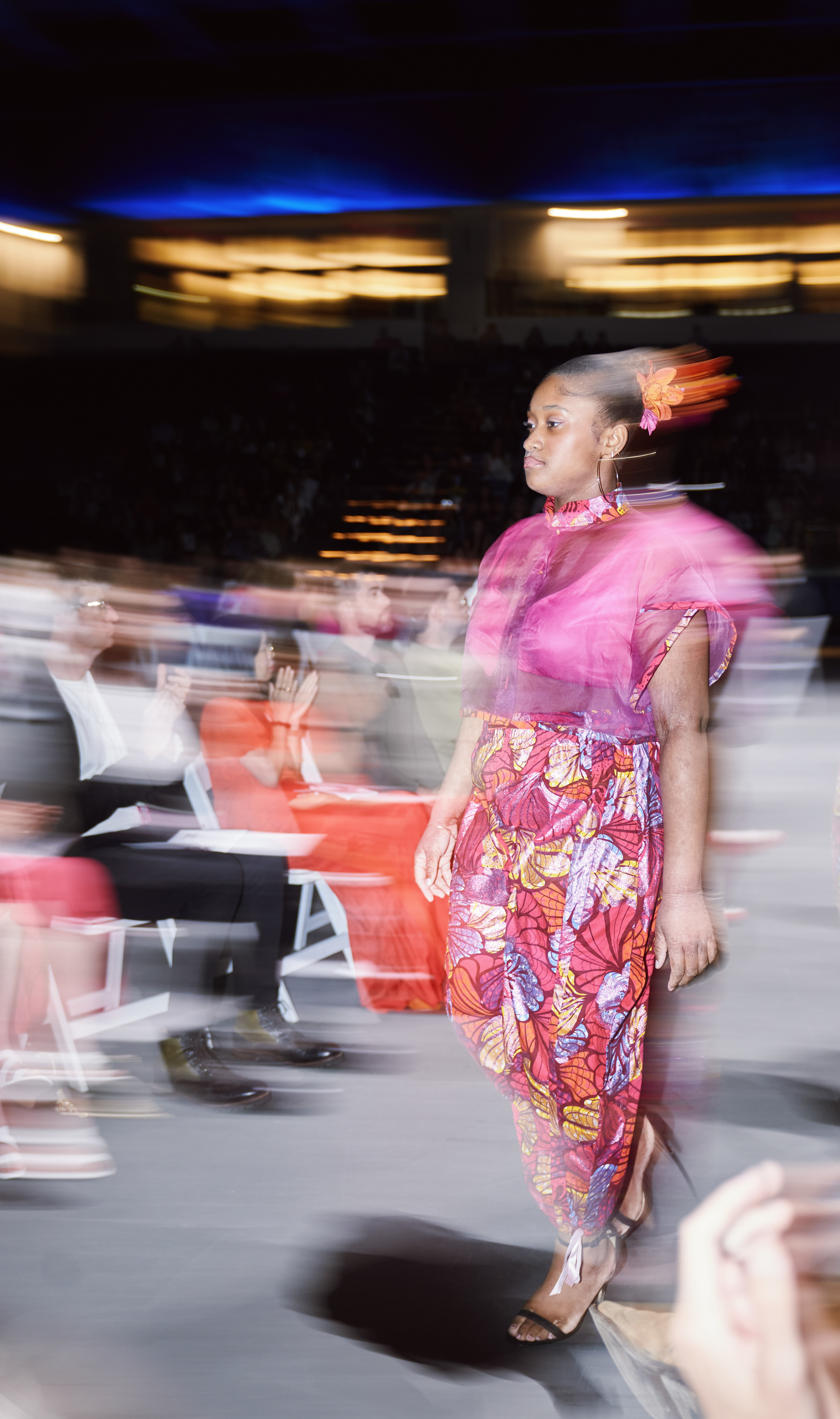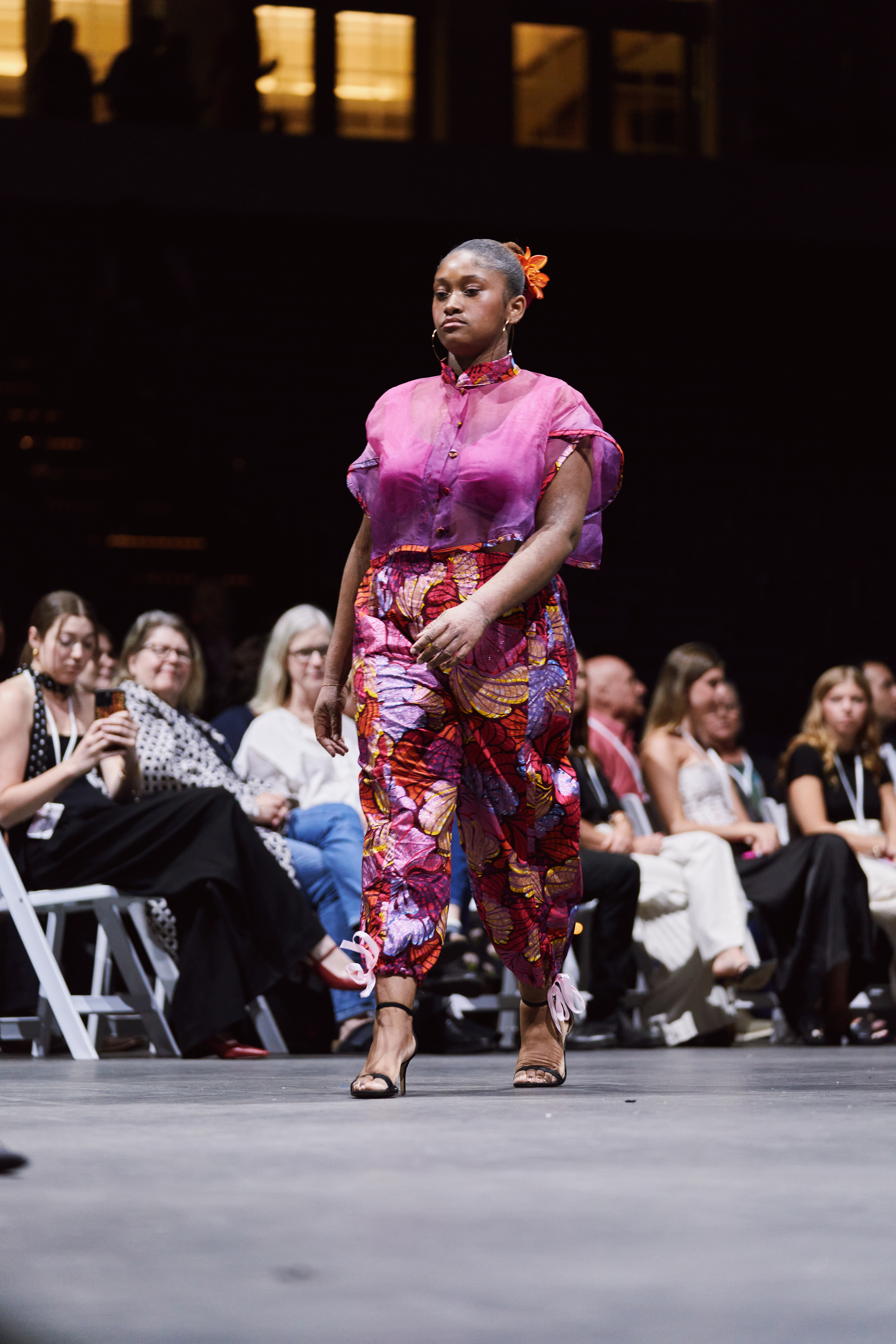 I opted to use a glitter African print fabric as the signature print and ombre dip-dyed silk organza as the complementary fabric. Solid stretch fabrics were used for the bra and a 100% cotton fabric was used for the wrap top in ORCHID's look.