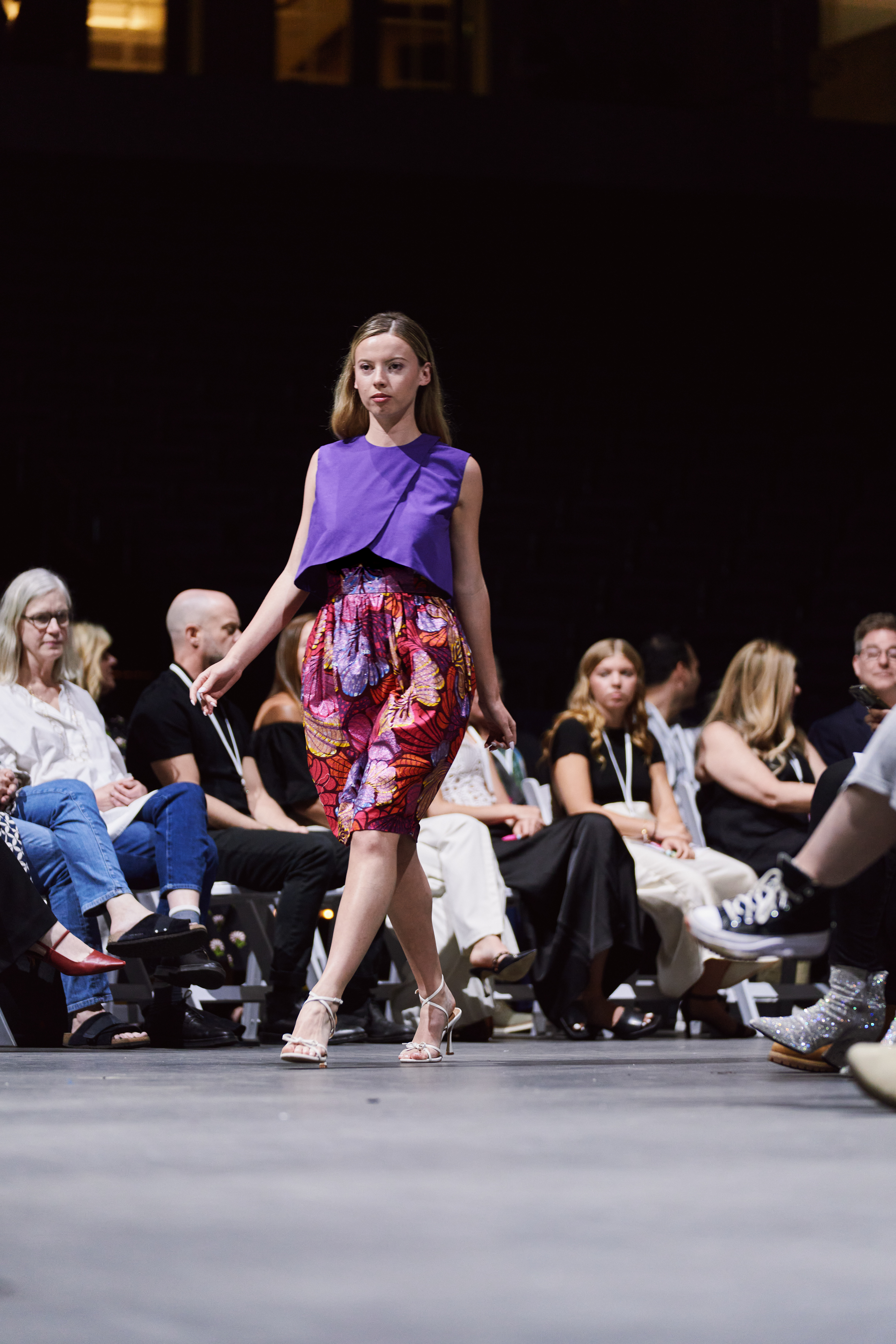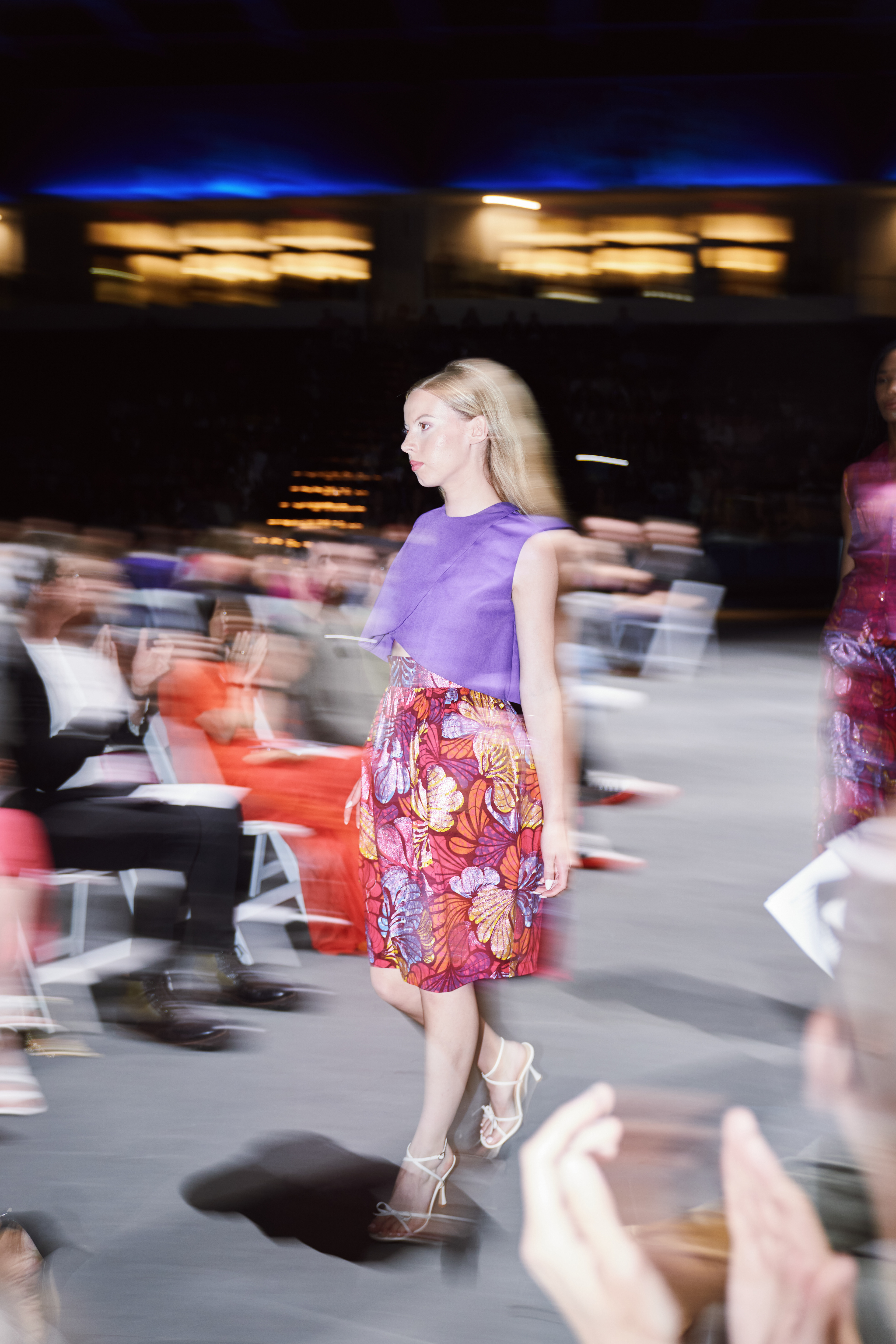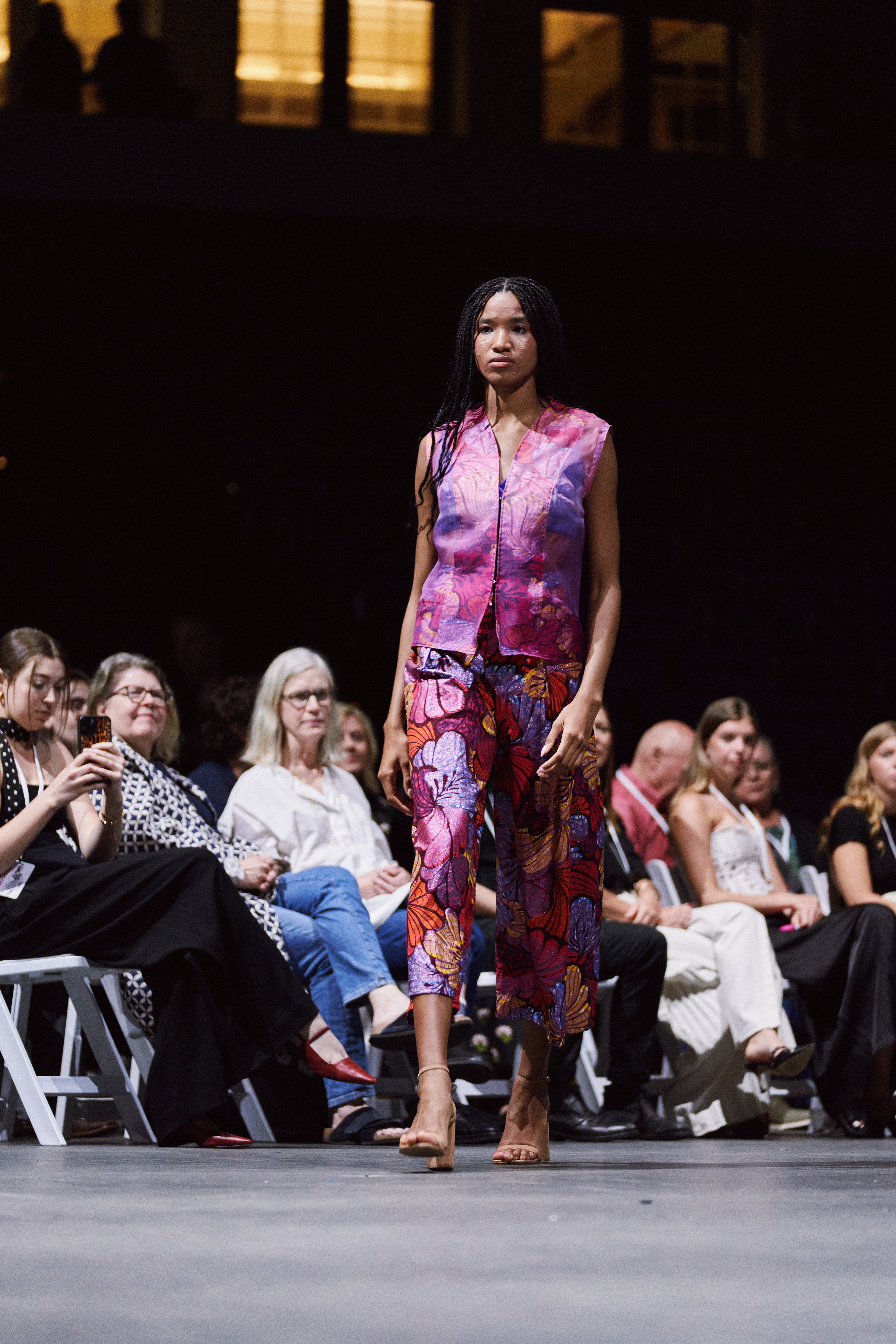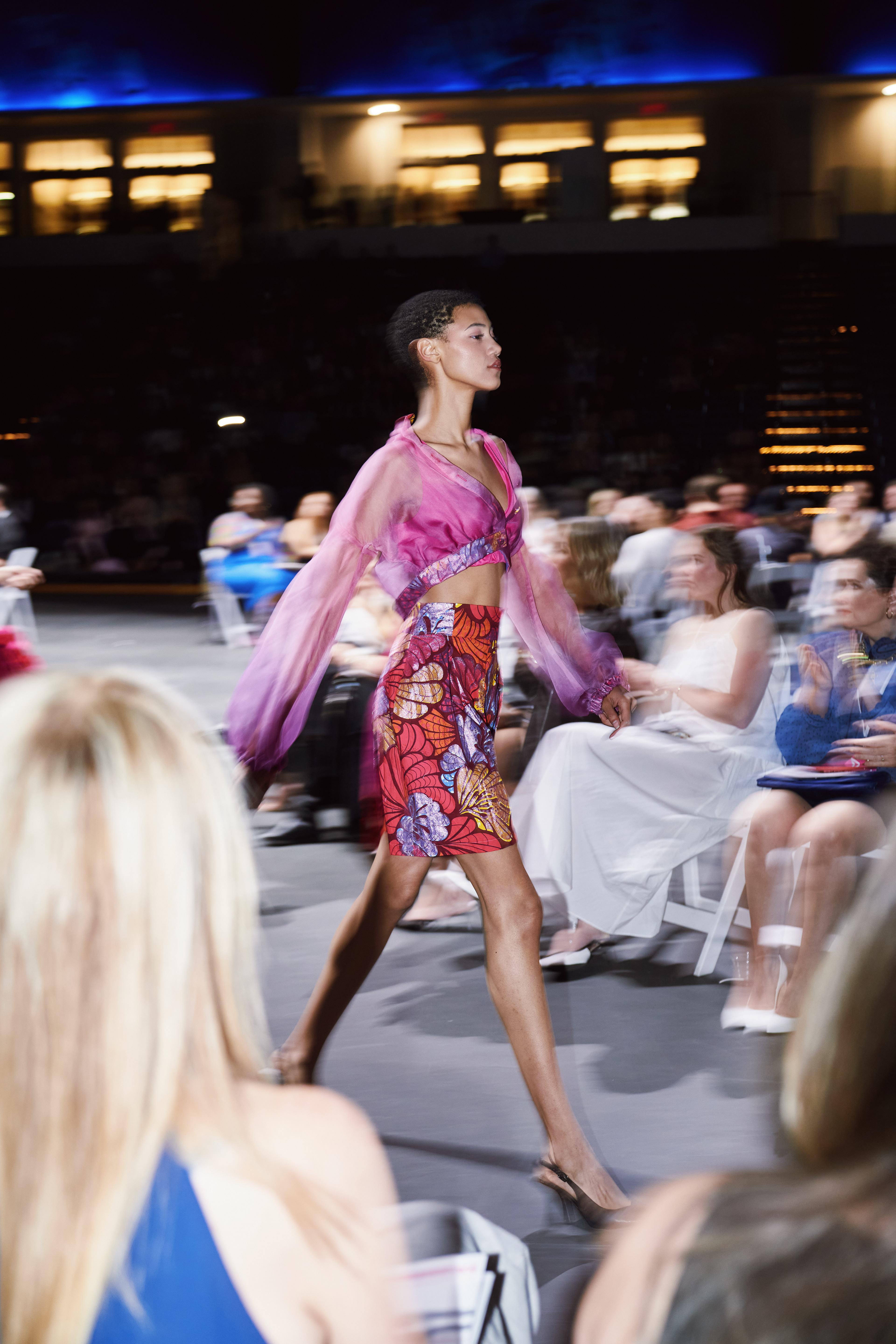 I opted to use a glitter African print fabric as the signature print and ombre dip-dyed silk organza as the complementary fabric. Solid stretch fabrics were used for the bra and a 100% cotton fabric was used for the wrap top in ORCHID's look.