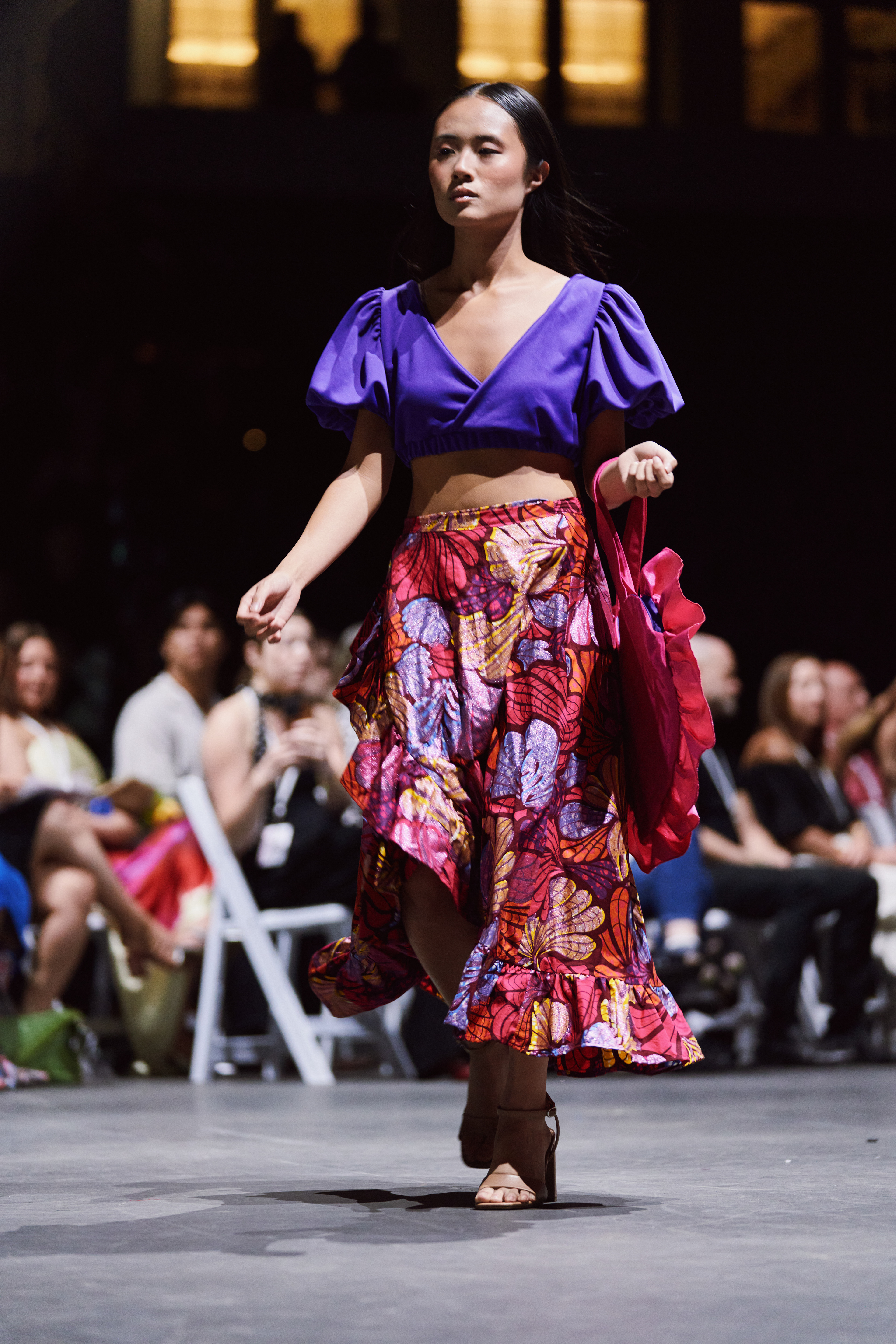 - Generous volume is incorporated into the ruffles of the skirt, bag and sleeves for added drama