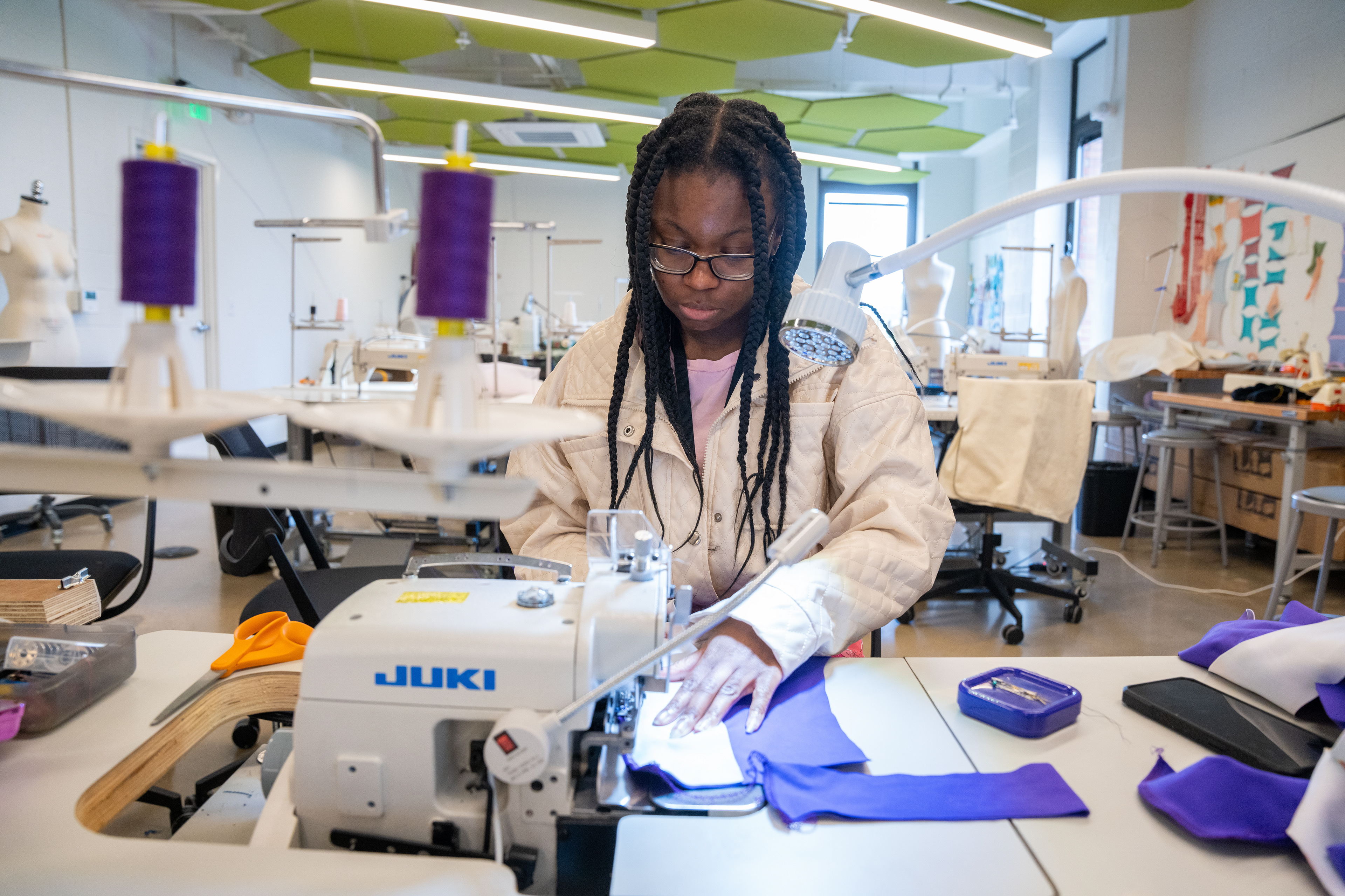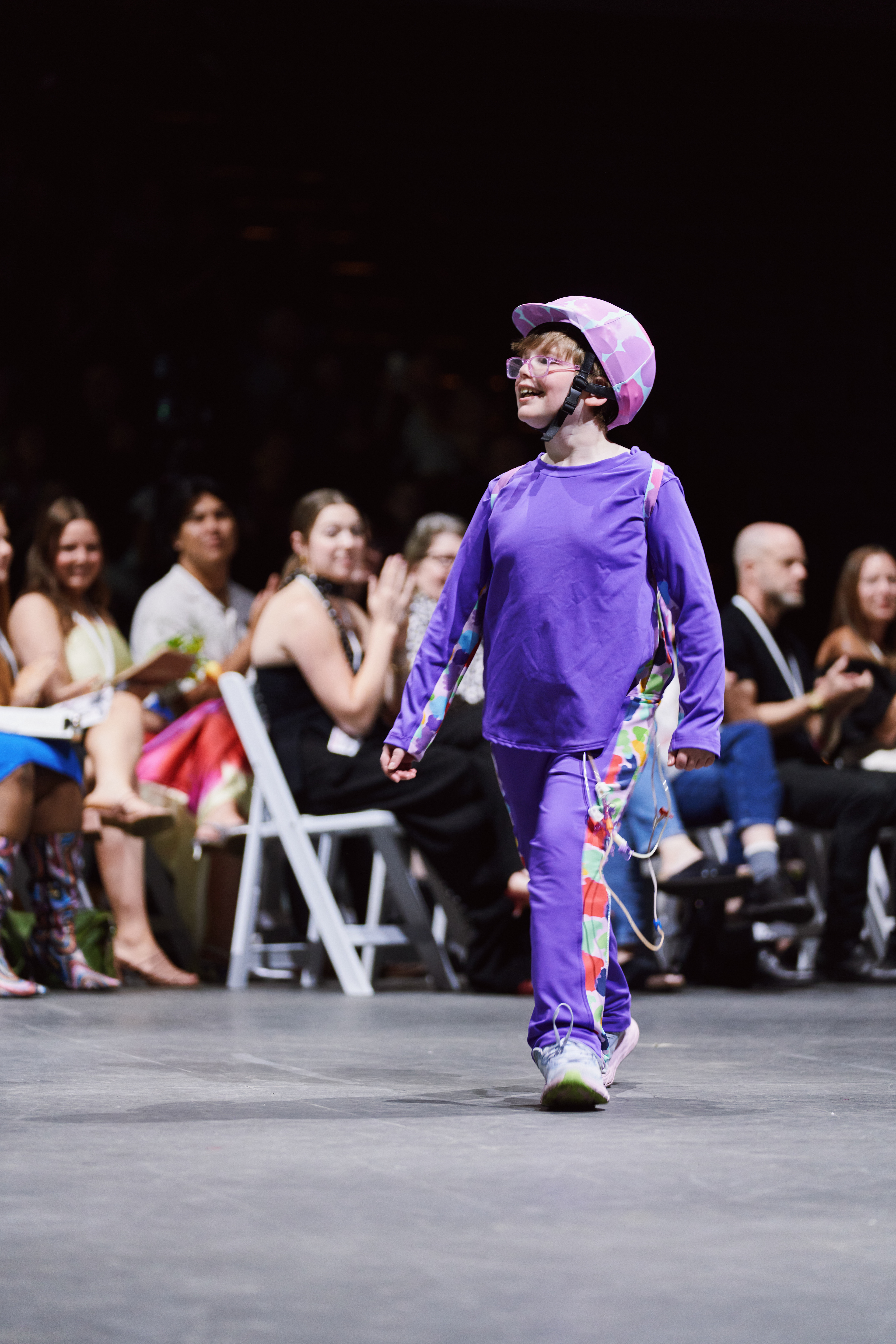 Decorative properties such as print and contrast were used to create visual impact. The design features bold, printed side panels with his artwork that continue from the shirt onto the pants to ensure a seamless and cohesive transition. This seamless transition embodies the spirit of his artwork, titled “Flow of Water.” Just as water moves effortlessly, adapting to its environment while maintaining its strength and beauty, the design mirrors this natural rhythm. To not wash out his skin color and to ensure his artwork is the highlight of the outfit, these panels are paired with a dark purple double brush fabric to create a beautiful contrast against the printed panels. Functional elements of the riding outfit include a versatile rainbow zipper that can also be used on his backpack and riding pants. To also complement his artwork, purple rainbow zippers were consciously chosen to be both stylish and functional. They are inserted into the side panels to ensure easy, independent dressing with his orthotics. The zippers feature large, easy-to-grip tabs, specifically chosen due to his limited dexterity skills. On top of the unique side zippers, the riding pants have a much wider leg to accommodate the orthotics more than standard riding pants. The backpack and riding helmet's print shares the same name as the artwork on the panels, creating a cohesive and meaningful connection between the pieces.